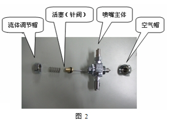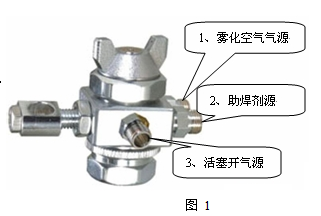 圖1為助(zhù)焊劑(jì)噴頭噴嘴外觀圖,主要有 3 道通路:霧化空(kōng)氣氣源通道,助焊劑通道和活塞(sāi)開啟氣源通(tōng)道。