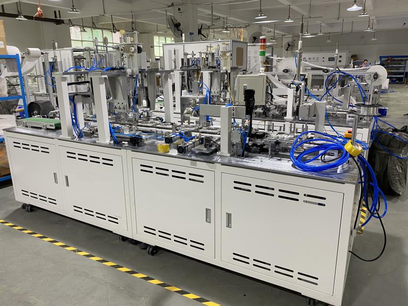 本機自動化程度極(jí)高,使用超(chāo)聲波焊接技(jì)術(shù)和PLC程序結(jié)合工作,僅(jǐn)需一人操作將口罩本體放置於模具(jù)上,後續工(gōng)作從鼻梁(liáng)條焊接、呼吸閥焊接、耳帶焊接、logo印刷至成品均為設備自(zì)動完(wán)成(chéng)。