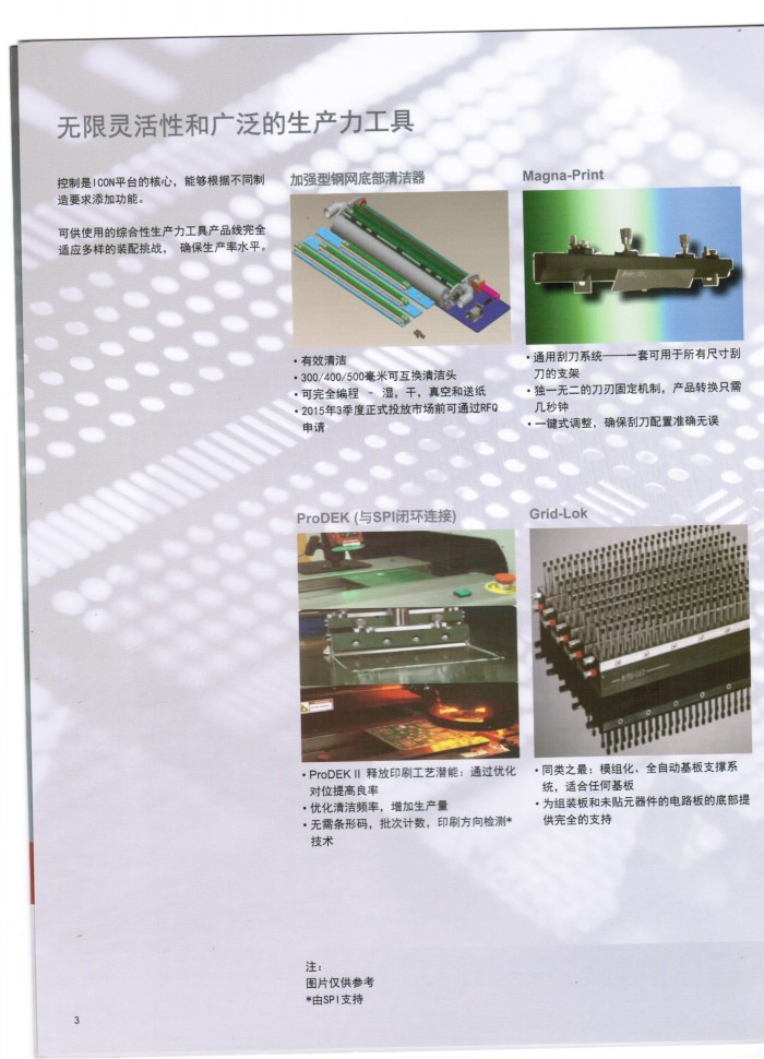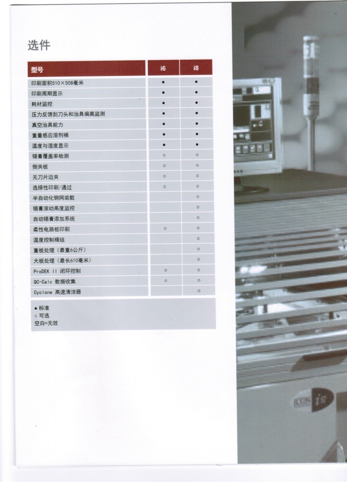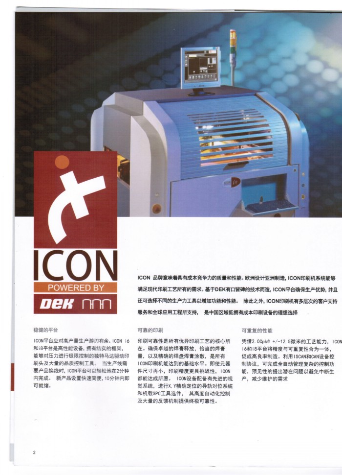 ICON品牌意味著具有成(chéng)本競爭力的質量和性能。歐洲設計亞洲(zhōu)製造,ICON印刷機係統能夠滿足現代印刷工藝所有的需求(qiú)。基(jī)於DEK 有口皆碑的技術而(ér)造,ICON平台確保(bǎo)生產優勢,並且還(hái)可選擇不同的生產力工具以增加功(gōng)能和性能。除此之外,ICON印刷機有多(duō)層次的客戶支持服務和全(quán)球應(yīng)用工程所支持,是中(zhōng)國(guó)區(qū)域低(dī)擁有成本印刷設備的理(lǐ)想選擇(zé)。